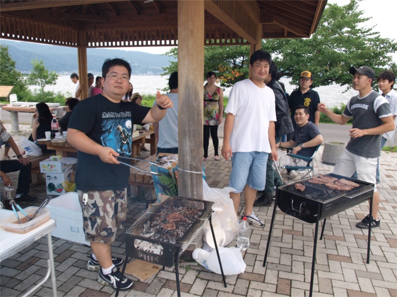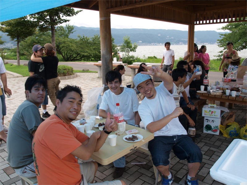 場所は諏訪湖畔の岡谷湖畔公園の一角です。前夜のすごい土砂降りにもかかわらず公園はぜんぜん被害もなく、予定通りのバーベキューパーティとなりました。出席者のほとんどは会社で派遣社員として働いていた日系ブラジルの人たちですが、景気悪化の影響でいまもいっしょに働いている人たちはこのうちのの数人だけです。失職中でもこういうパーティで楽しむブラジルの人たちにはある意味けっこう感心させられますね。