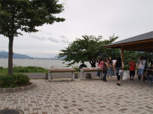 前夜からの曇天で、諏訪湖も濁った波が立っているあいにくの天気でしたが、幸い、雨には降られずにパーティをすることができました。