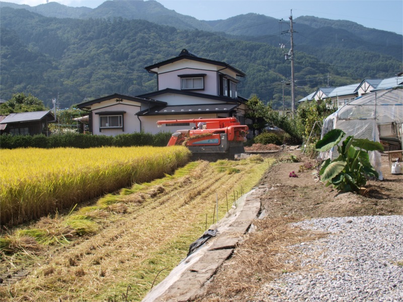 この気持ちのいい朝の眠りをけたたましい騒音でいきなり起こされてしまいました。2階のベランダからのぞいてみると、お隣さんの田んぼにコンバインが入ろうとしています。