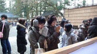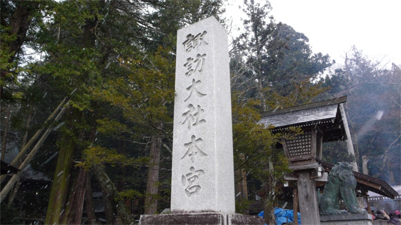 冷たい風が吹いて、雪もときおり舞うあいにくの天候でしたが、諏訪大社上社は初詣の参拝客でけっこう混んでいました。