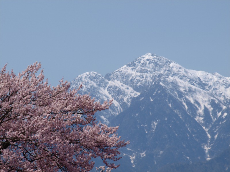 甲斐駒ヶ岳の遠景に満開の桜が重なり、素晴らしい花見ができました。