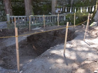 諏訪大社上社では来週に迫った御柱祭里曳きのために古い(前回の)御柱が抜かれて大穴となっていました。