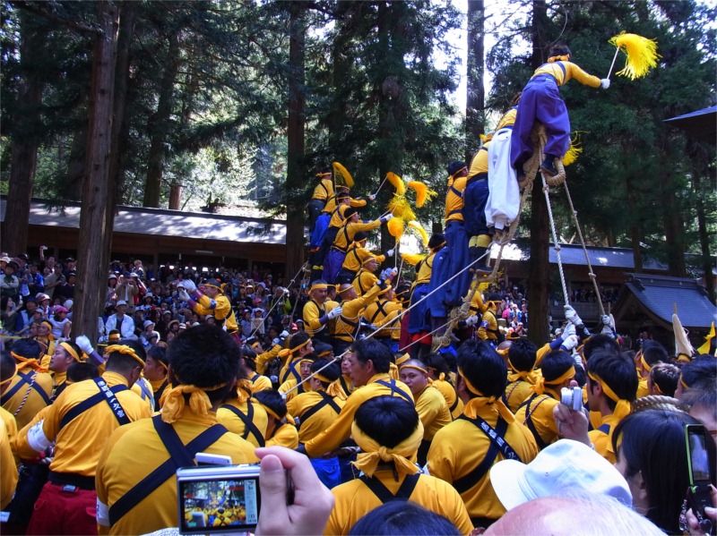 上社の御柱は下社の御柱と違ってメドデコと呼ばれる2本(前後で4本)の角(ツノ)が取り付けられているのですが、そのメドデコの幅は鳥居より大きいのです。重さ10トンの巨木が人の力だけでメドデコを交互に傾けて狭い鳥居をくぐり抜けるのは見ていて本当に圧巻でした。