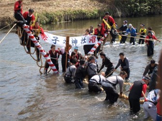 「赤沼子之神社(あかぬまねのかみしゃ)」の御柱の最大の特徴は「木落とし」と「川越し」のあることです。