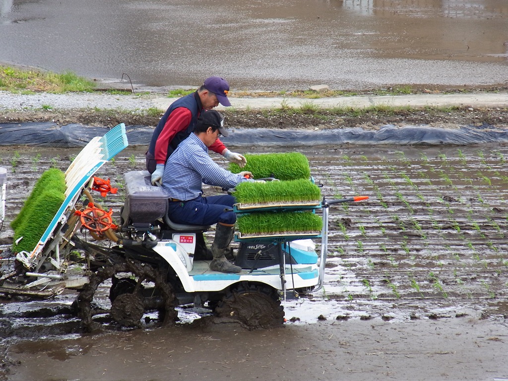 お隣さんではいつも農作業をしているおじいちゃんの具合が悪くて入院されていて、「今年は田んぼやるのかなぁ」って思っていたんですが、例年通りの田んぼ風景になりました。今日は、小学校の先生をしている息子さんが、JAの人の指導を受けながら(?)田植え機を動かしていましたね。