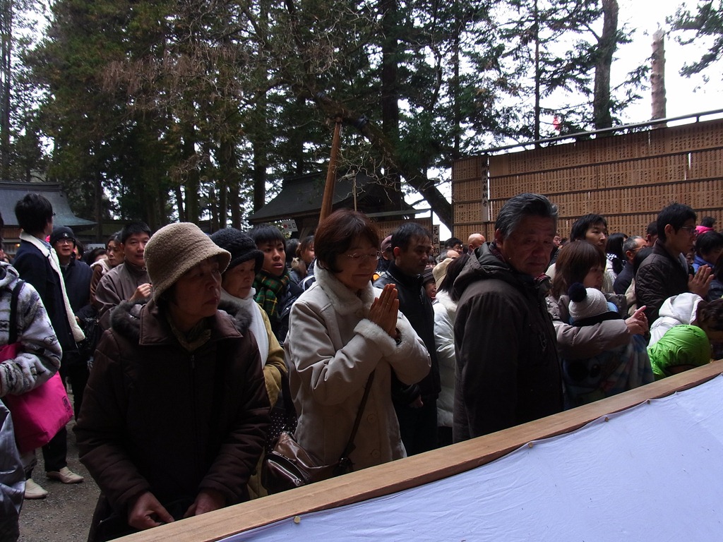 今年はあいにくの曇り空、自宅から歩いて、ちょうど上社についた頃には雪もチラホラしてきました。寒かった~
