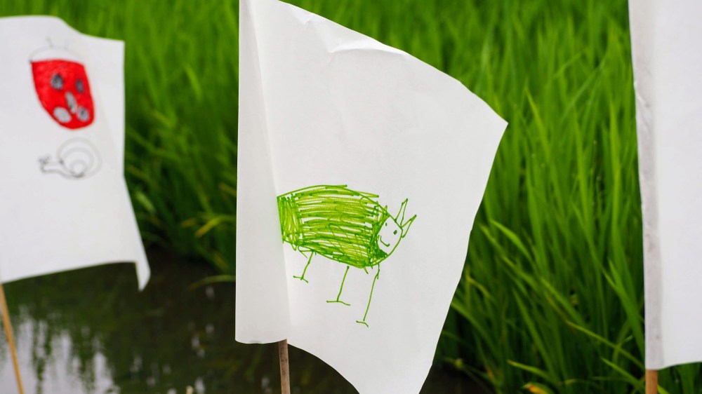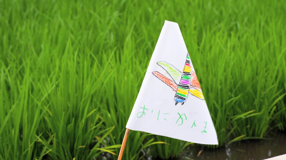 我が家の前はわずか数分で通り過ぎていきましたが、田んぼには子供たちが挿していった「稲虫の旗」がいっぱい残っていました。