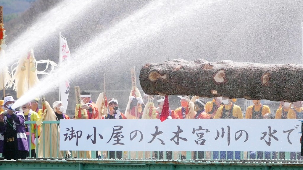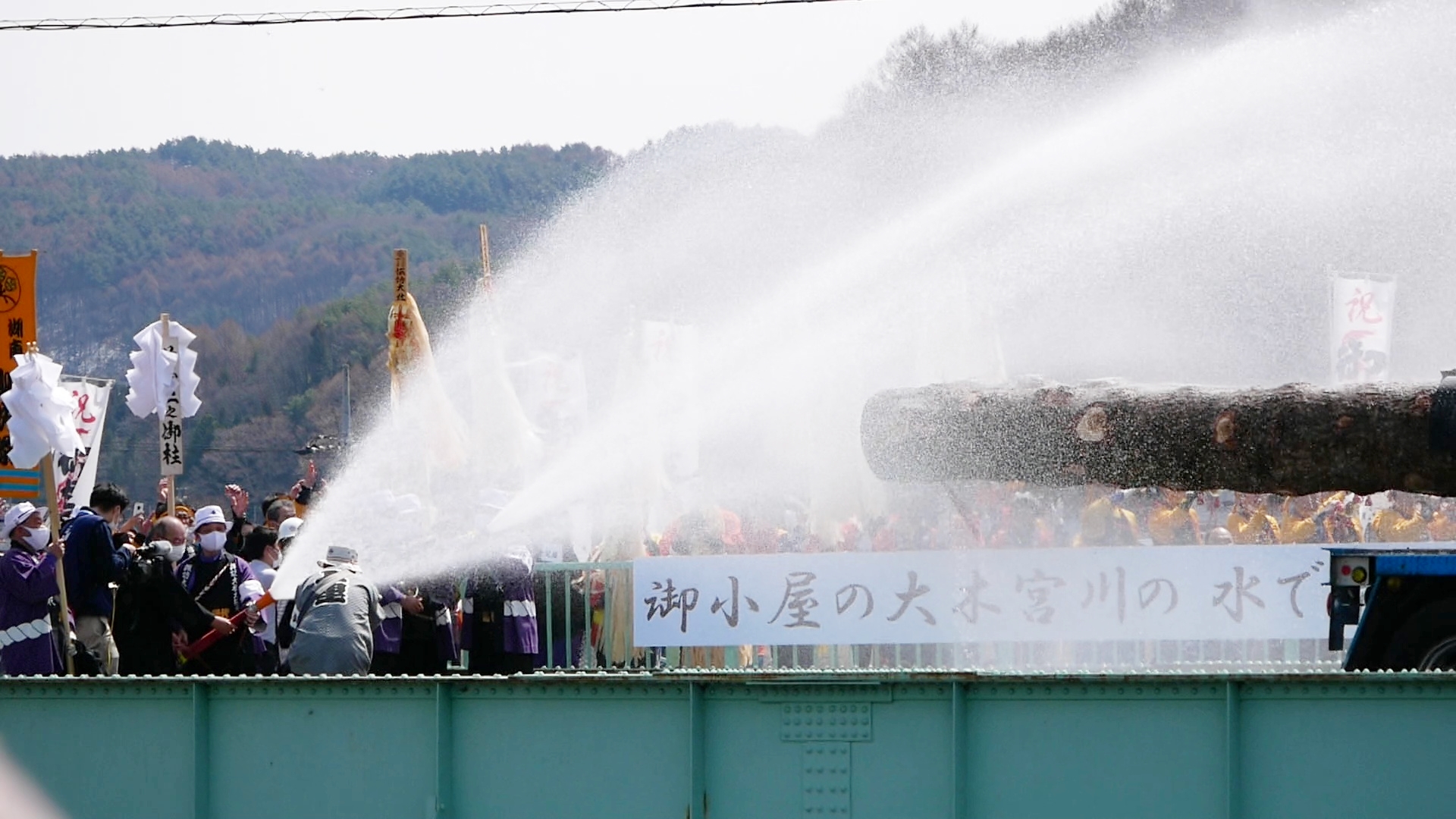 山出し当日の4月2日、私の地区の担当の「前宮二之柱」は「本宮二之柱」とともにトレーラーで運搬されてきました。本来、人の手によって「川越し」が行なわれる宮川ですが、トレーラー積載のまま宮川橋の上で停車しました。宮川の雪解け水を消防ポンプでくみ上げ、担当地区の大総代が筒先を手にして放水、お清めが行なわれました。その後、トレーラーは近くの「御柱屋敷」に到着、上社の御柱8本が整然と並べられました。
