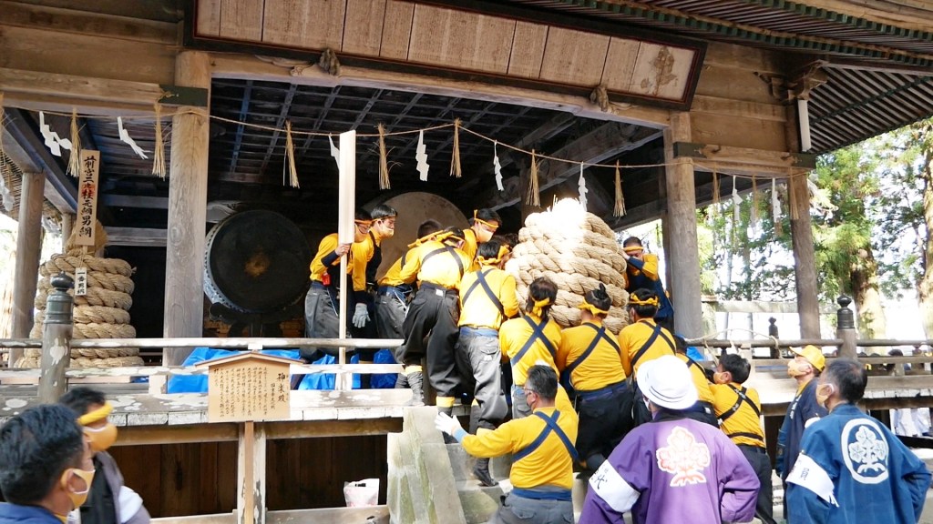上金子区が担当し「綱打ち」を行なったのは「前宮二之柱 二番男綱」です。前回2016年の御柱での「綱納め」は大勢の参加者があり、たいへん盛大に行われましたが、コロナ禍の今回は各地区に割り当てられた最低必要な人員のみでの参加となりました。「前宮二之柱」の曳行担当となった「湖南・中洲」地区から計12本の曳き綱が続々と上社本宮境内に運び込まれ「神楽殿」に奉納されました。