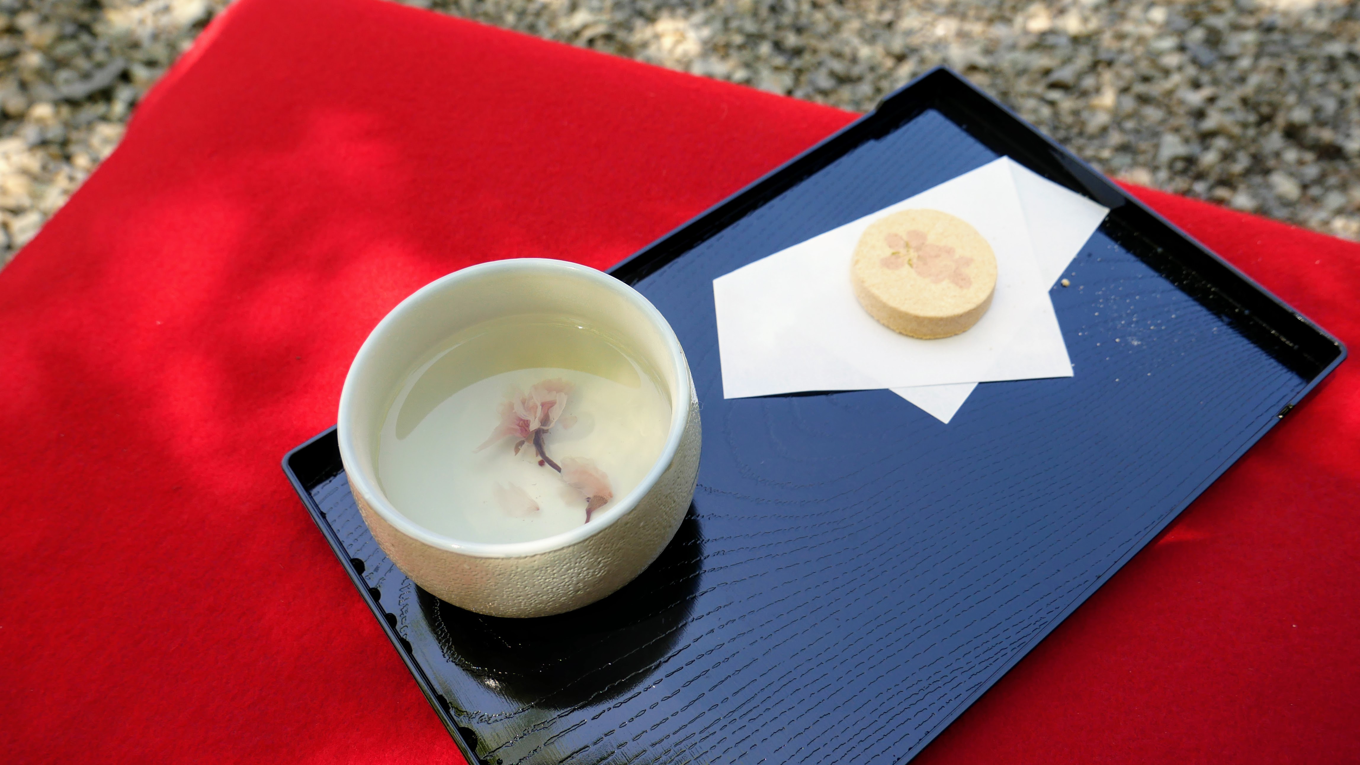 境内では明日からの例大祭でお神楽を舞う舞台の設置準備が行われていました。いつもは閑散としている印象のあるここ金櫻神社ですが、今日は大勢の花見客が来ており、桜茶のサービスもされていました。