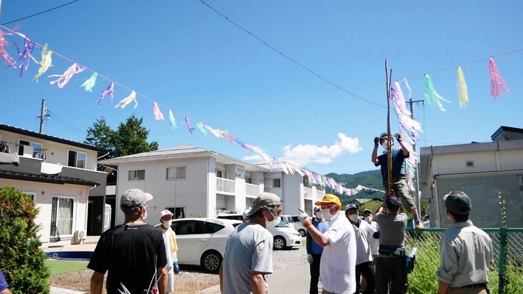 朝から気温30度を超える猛暑の中、お宮の参道を起点に約600mの飾り綱を設置しました。参加した祭典委員の皆さんには暑い中たいへんお疲れさまでした。