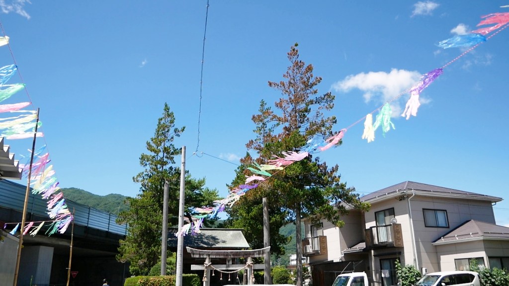 地区の小宮の御頭御社宮司社(おとうみしゃぐじしゃ)御柱祭の曳行路飾り付けが行われました。