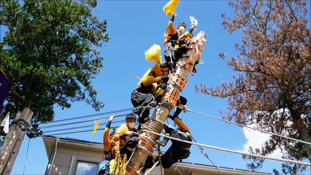 2日目最終日の「建御柱」は前日のもやもやを吹き飛ばすような素晴らしい晴天となってくれました。最高の御柱日和でしたね。7人の若連を乗せて徐々に立ち上がる御柱を区民が木遣りで応援します。約1時間かけて直立した一之柱の上からは若連手製の「感謝の垂れ幕」がおろされ、続けて宝投げが行われました。