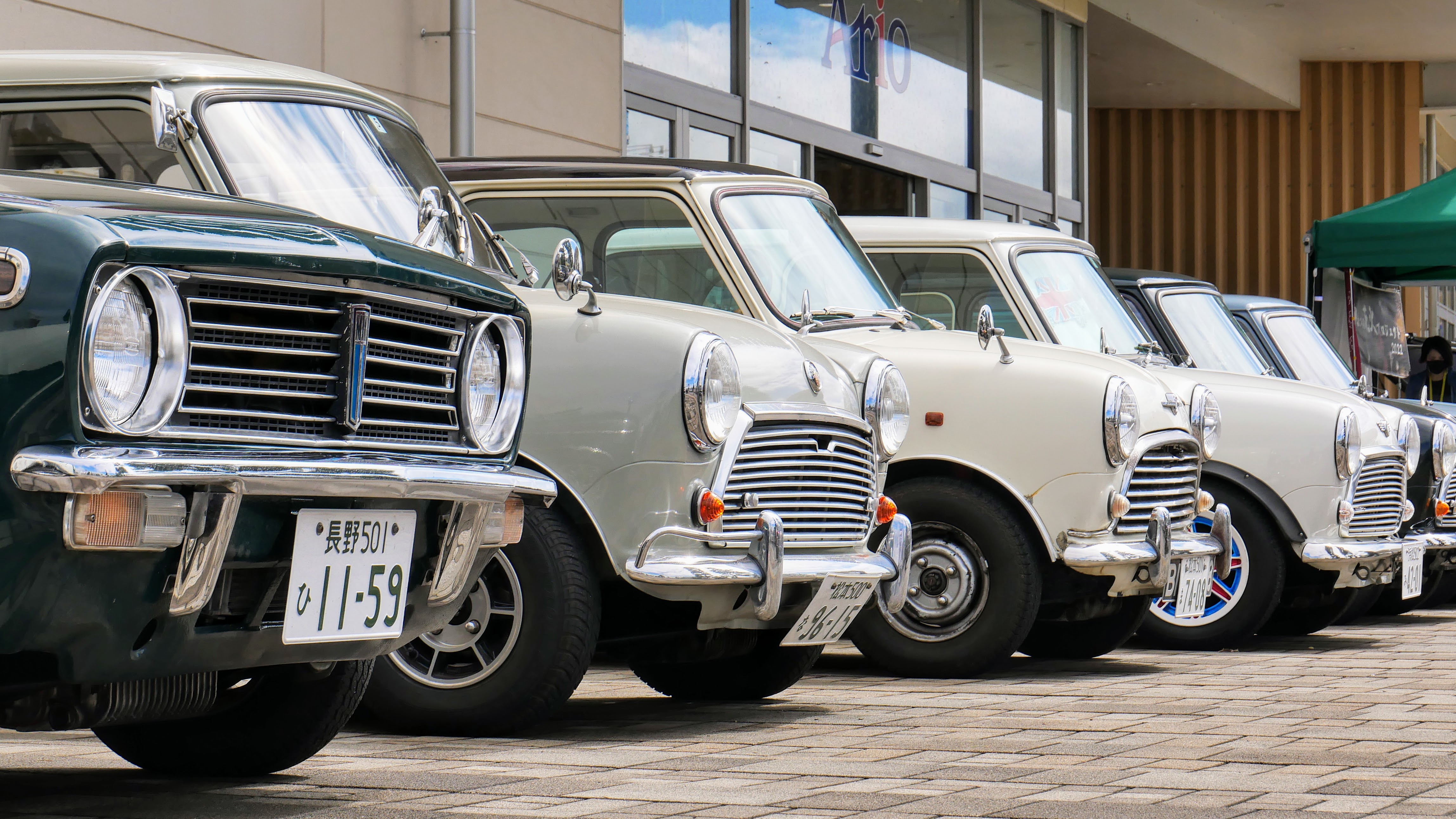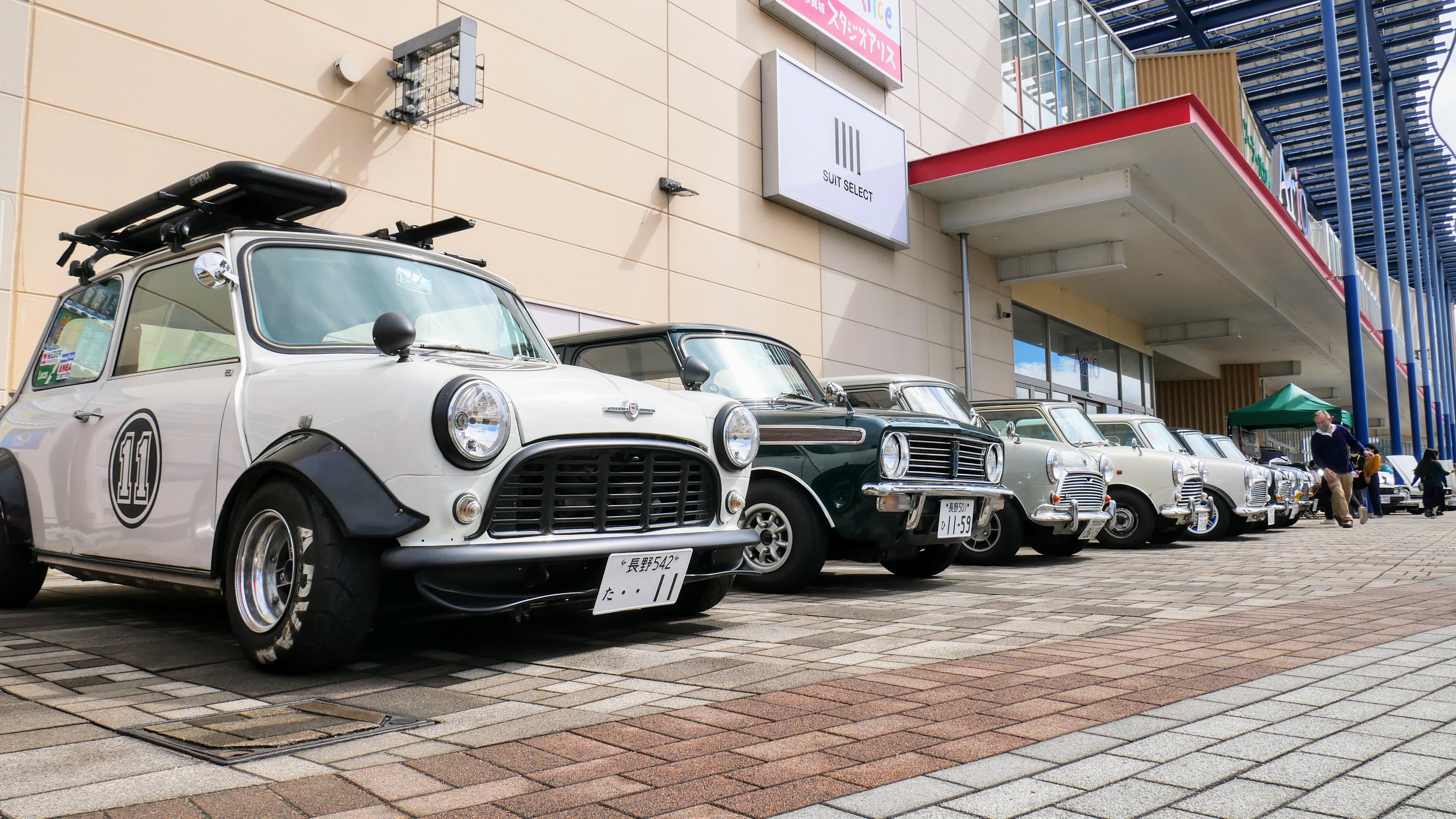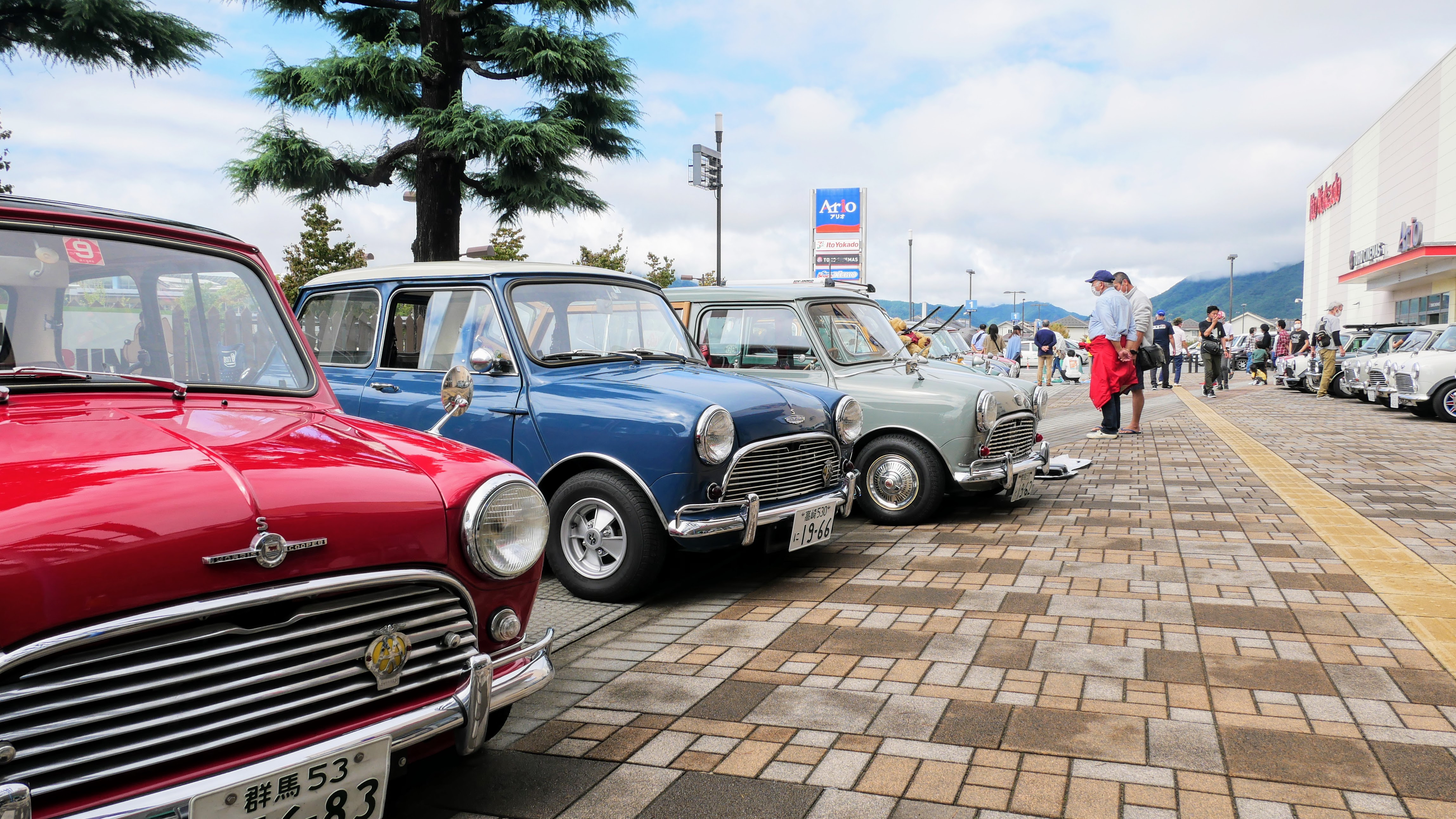 このイベントに参加したクラシックMINIは、近場から自走してきた車もあり、地元ナンバーの「長野」や「松本」「諏訪」、割と近いお隣県の「群馬」「高崎」といったナンバーが目立ちました。一人の「諏訪」ナンバーのオーナーの方は、こういうイベントで何回かお会いした方でした。「まさか上田のイベント会場で諏訪の人と会うとは..」って笑っていました。