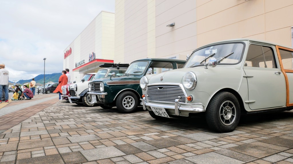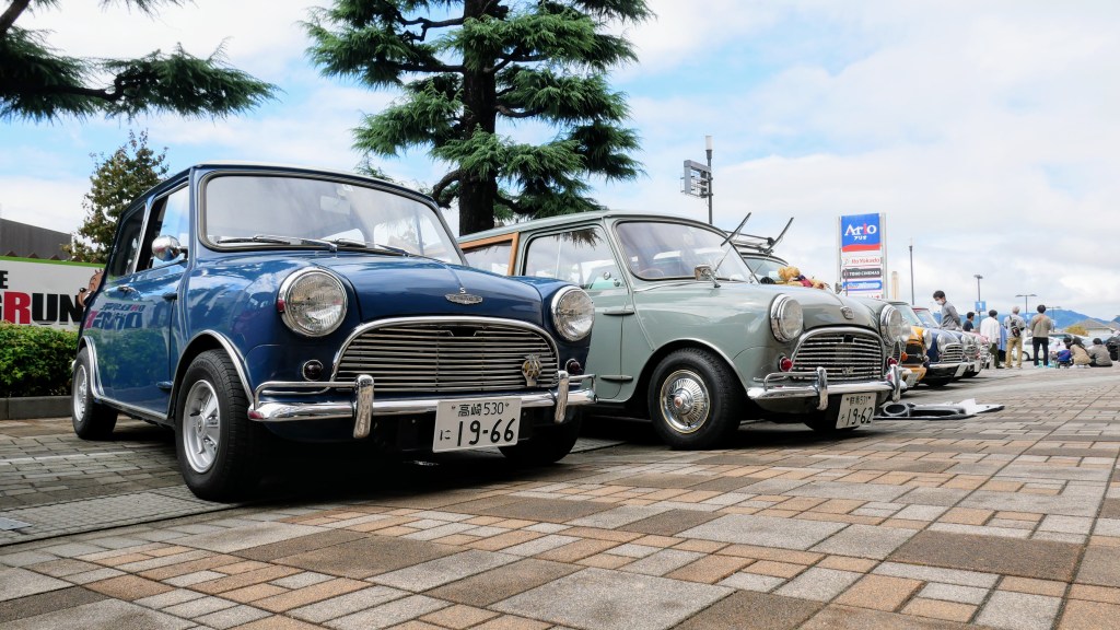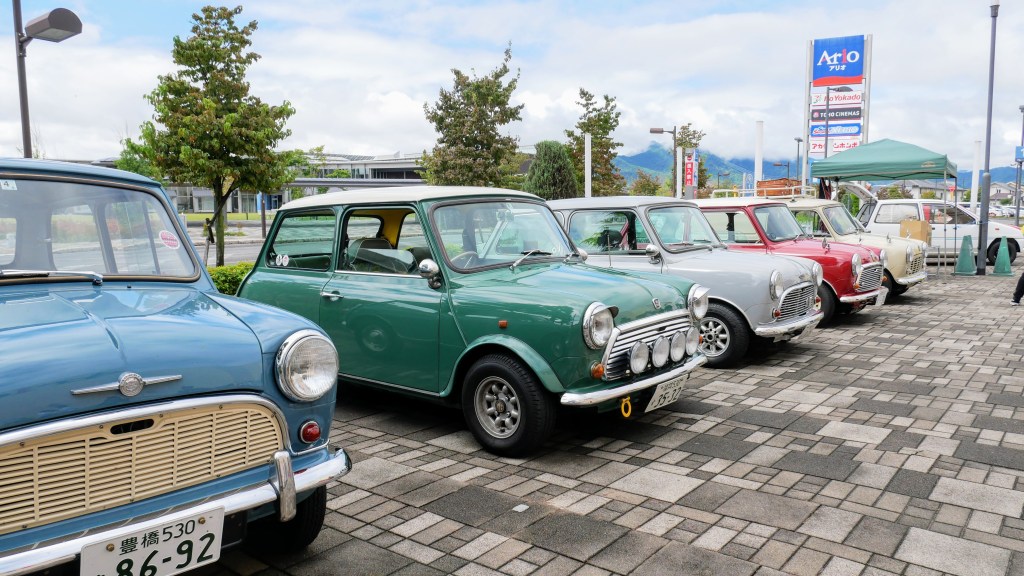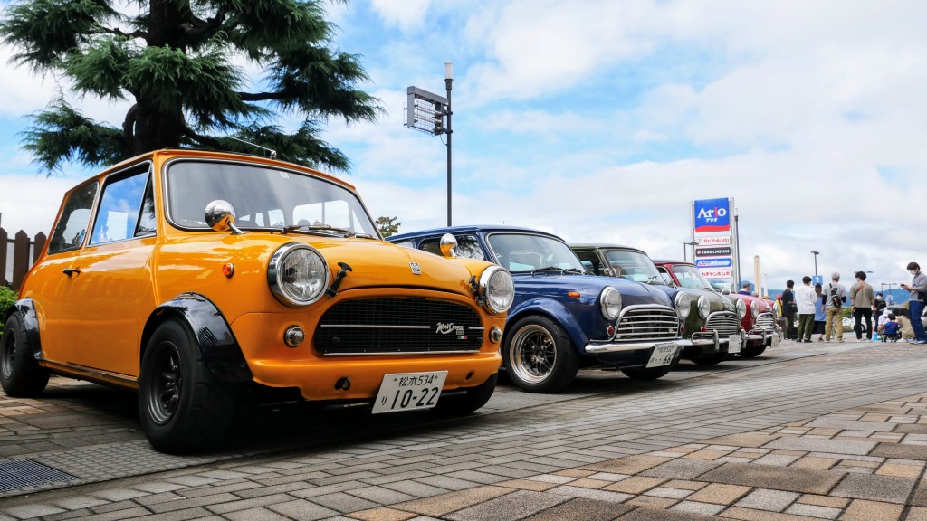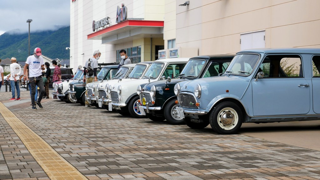 このイベントに参加したクラシックMINIは、近場から自走してきた車もあり、地元ナンバーの「長野」や「松本」「諏訪」、割と近いお隣県の「群馬」「高崎」といったナンバーが目立ちました。一人の「諏訪」ナンバーのオーナーの方は、こういうイベントで何回かお会いした方でした。「まさか上田のイベント会場で諏訪の人と会うとは..」って笑っていました。