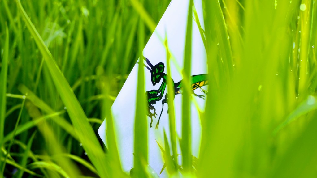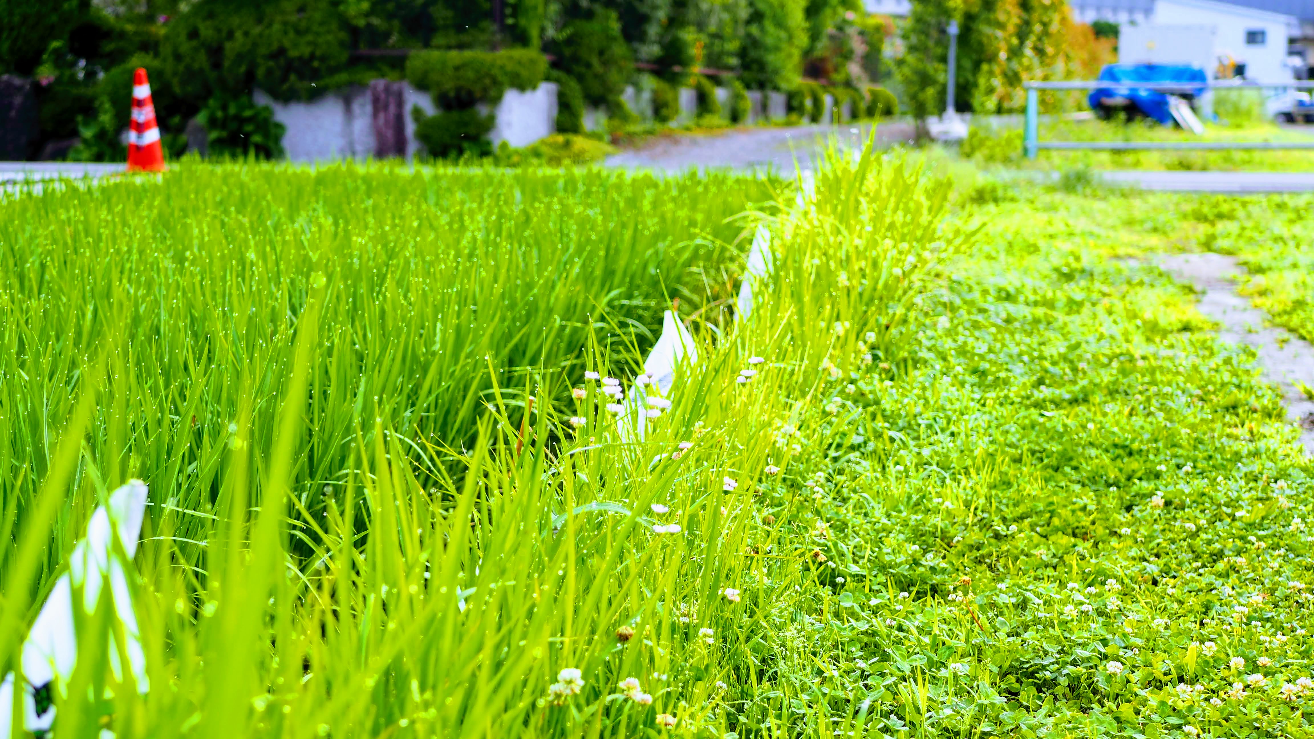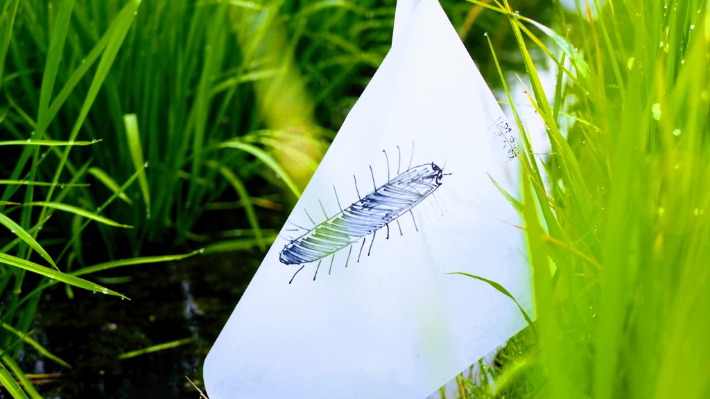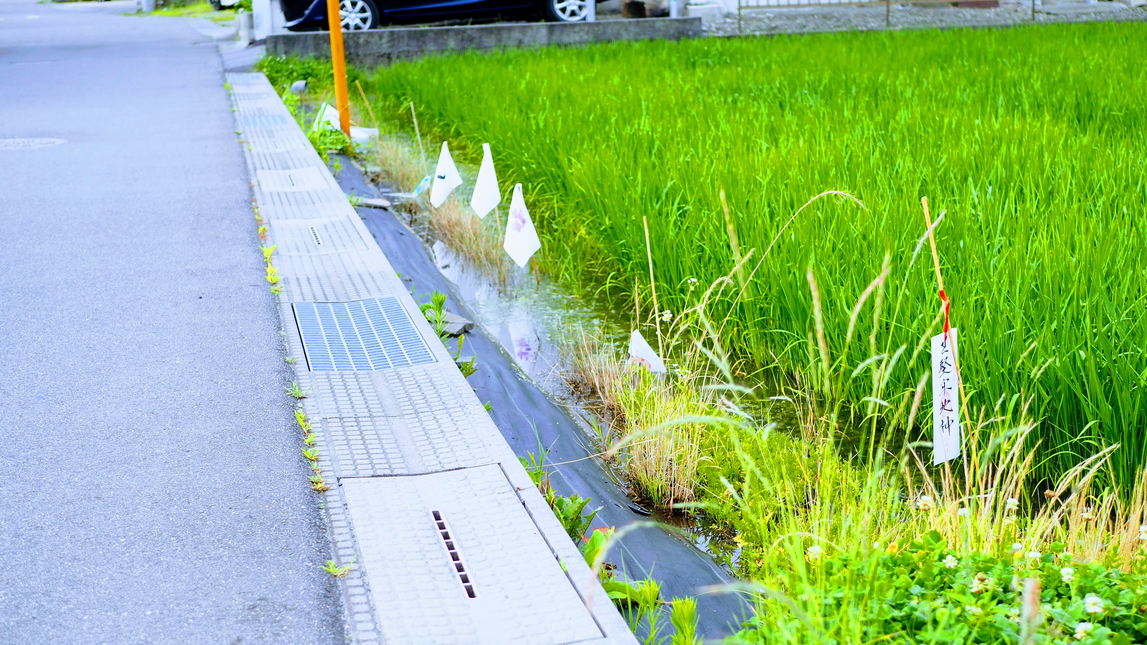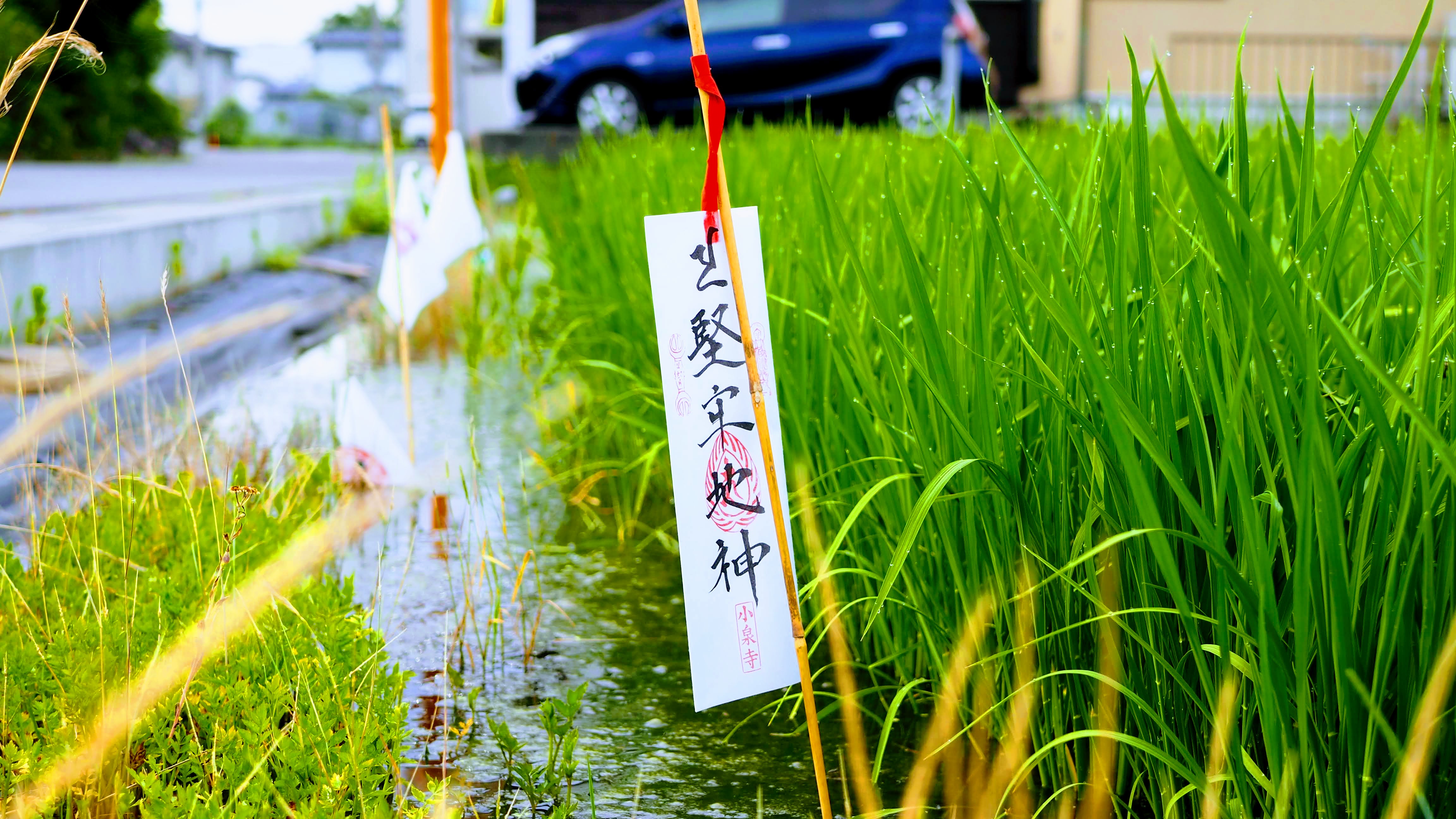 翌日、我が家の近くの田んぼにはへんぽんと揺らめく「稲虫の旗」や「水神様の旗」がありました。子どもたちに代わって役員の方たちが差していってようです。