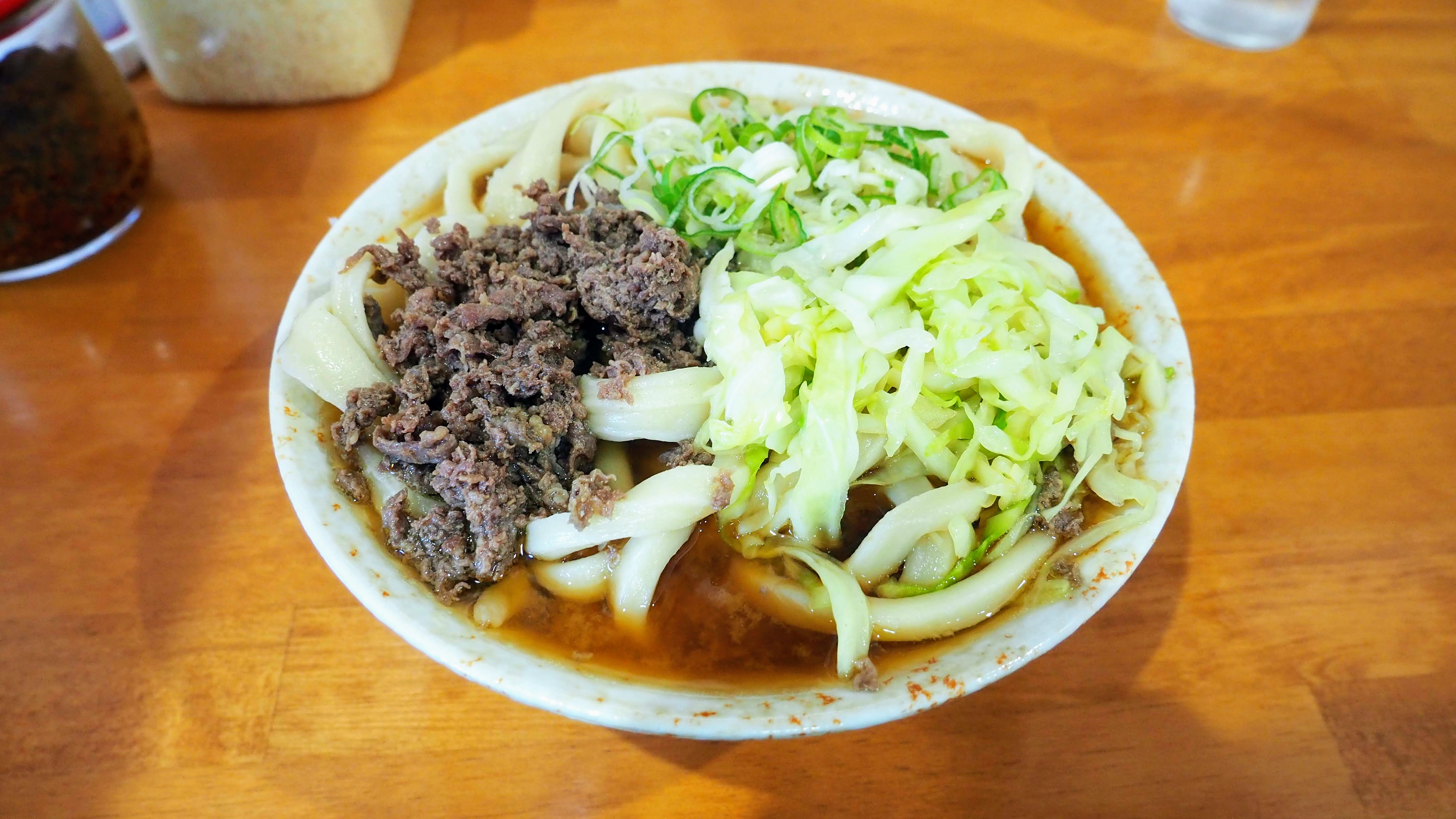 目的地の「たけ川うどん山梨店」には11:00ころに到着。店内はもう満席状態でした。ちよっと待った後に空いたカウンター席に案内されました。さっそく、いつもの「肉うどん」を注文。これまたいつものように1分もたたずに運ばれてきました。一口食べて「あ~、同じ味だ~!!」と感動。