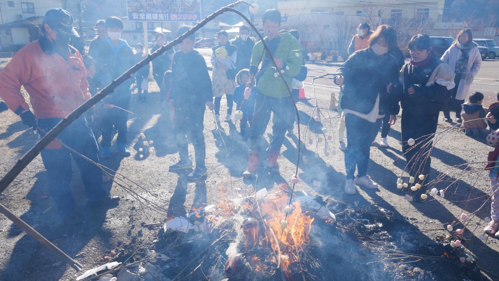 地区のお正月の恒例行事「どんど焼き」と「厄投げ」が行われました。