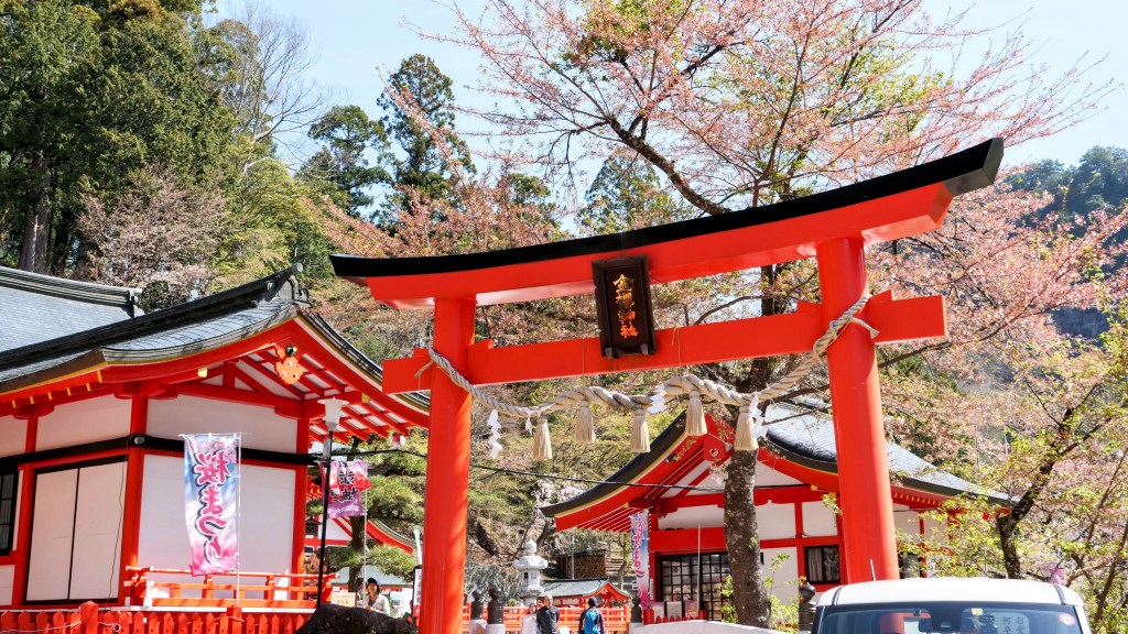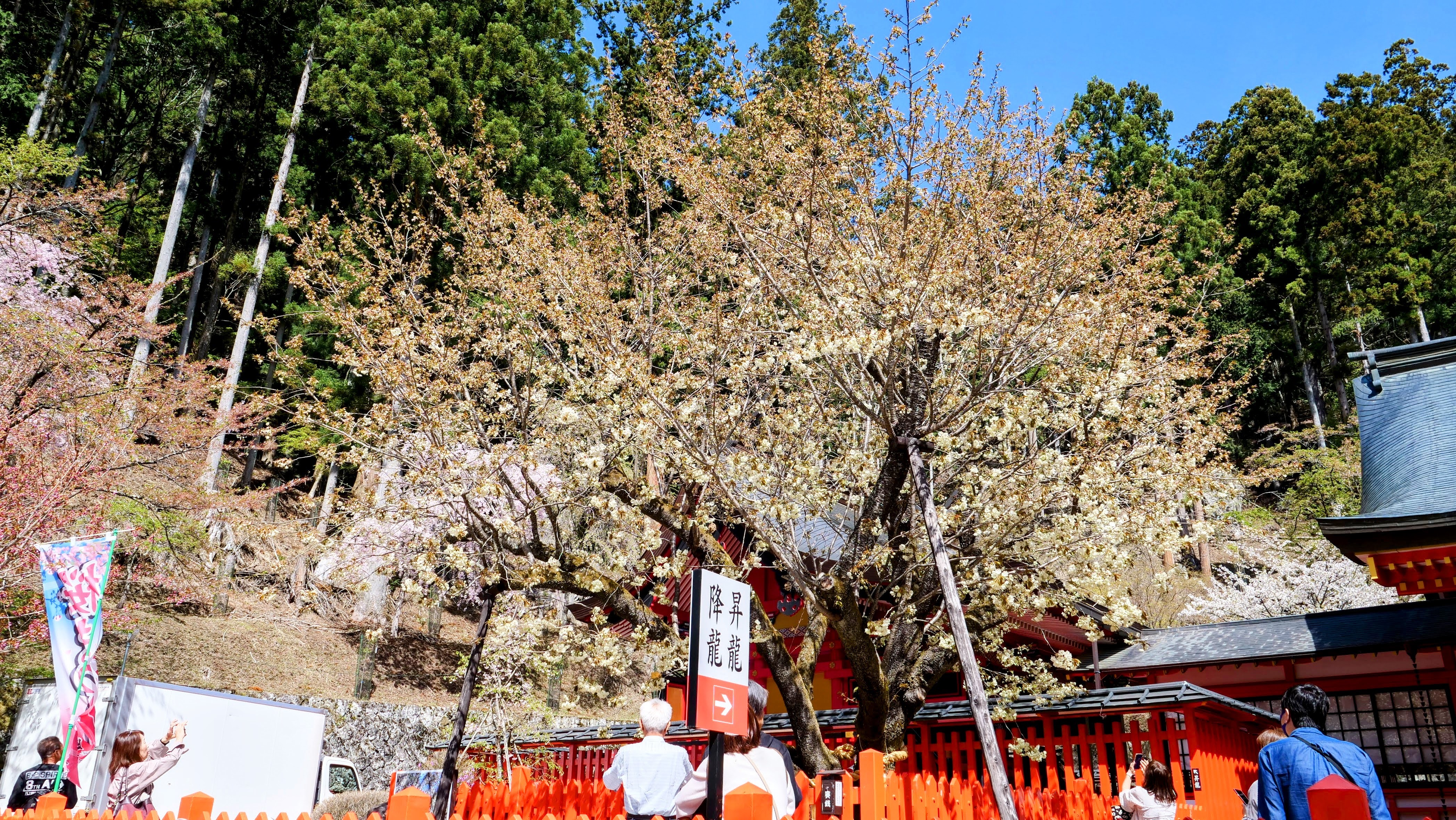 ここの御神木「鬱金桜 (ウコン桜)」の開花に合わせて、毎年参拝に来ています。朝の開花状況は三分咲きとのことで、あと数日で満開ではとの情報でした。でも、晴天の日は今日だけで、明日からはずっと一週間ほど雨の天気予報です。ちょっと悩みましたが、三分咲きでも青空の下の「ウコン桜」を見に行くことにしました。