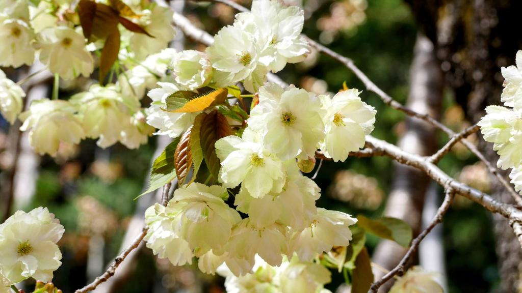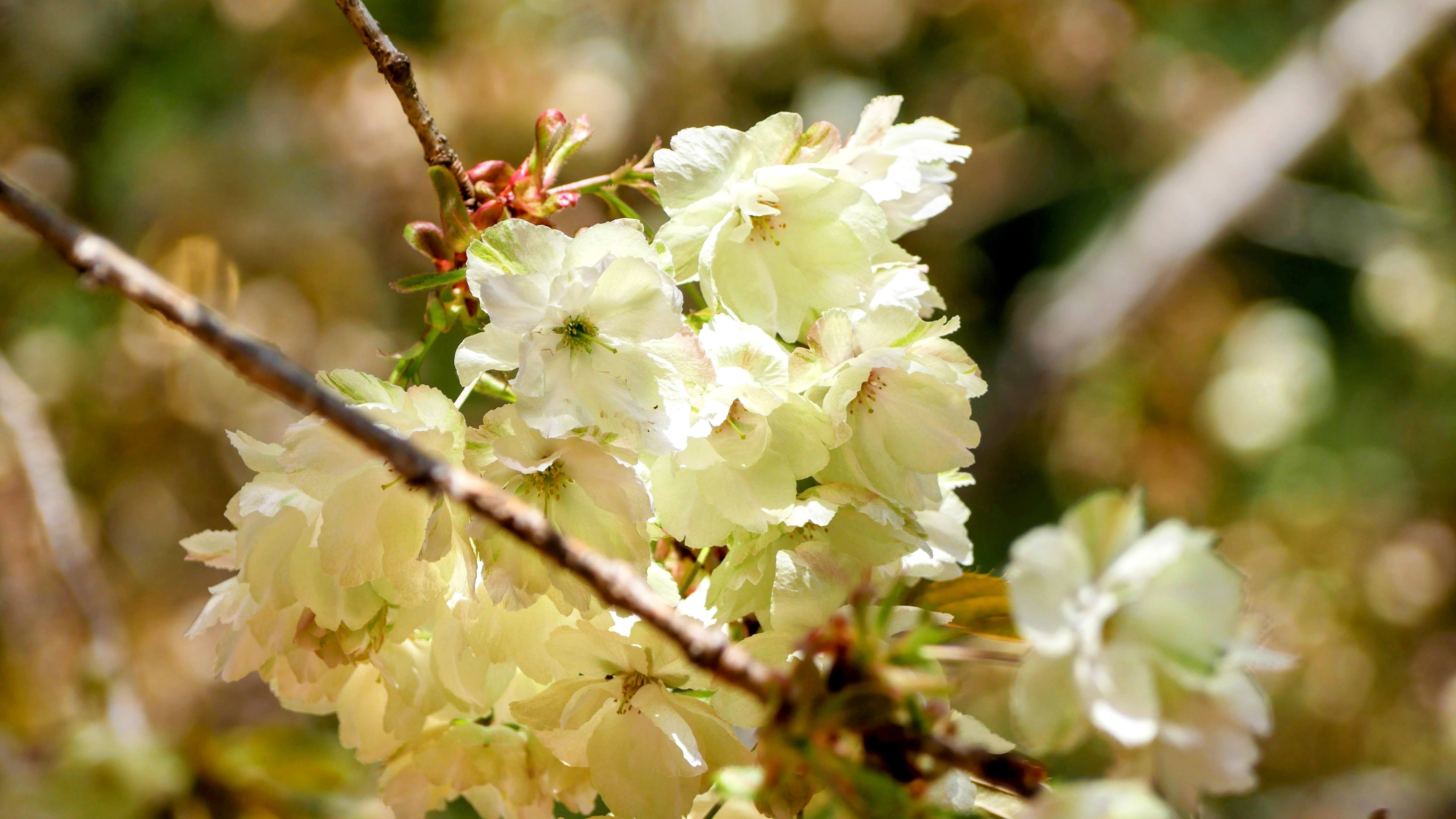 9:00の到着時には駐車場はすでにいっぱいでした。まず最初に本殿にて参拝。神社をぐるっと一周して最後に「ウコン桜」の前に来ました。朝の開花情報どおり、一部の花だけが開いている三分咲きでした。昨年、この金櫻神社を訪れた時はすばらしい天気に恵まれて「ウコン桜」もほぼ満開だったことを思い出しましたが、今年も少ないとはいえ、薄い緑がかった黄色味の独特の「ウコン桜」を堪能できました。しっかり写真も撮ってきましたよ。