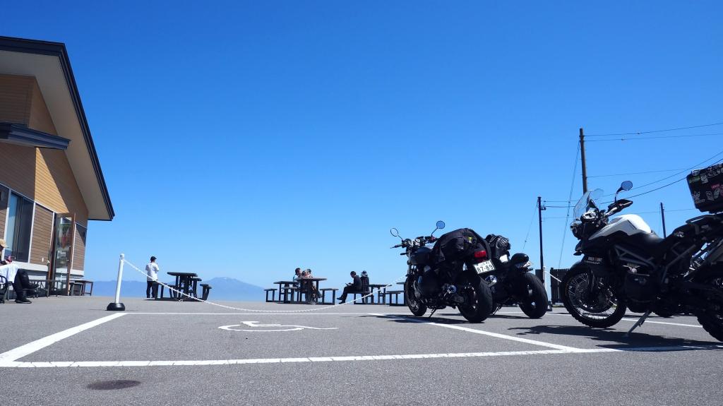 混雑する「白駒の池」駐車場を通り越し、小海町側へ下った「レストハウスふるさと」で最初の休憩を取りました。ここからの景色はすばらしいですね。浅間山がくっきり見えました。