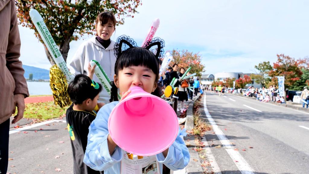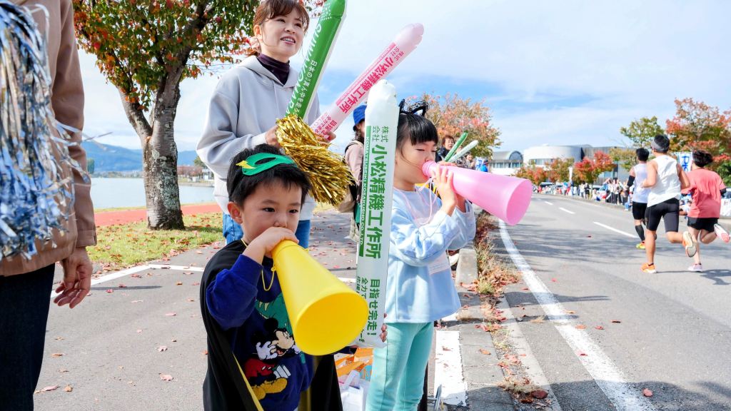 昨年と同様、この諏訪湖マラソンにエントリーしている娘のダンナさんの応援に私と奥さん、娘と二人の子どもたち、5人で応援に出かけました。