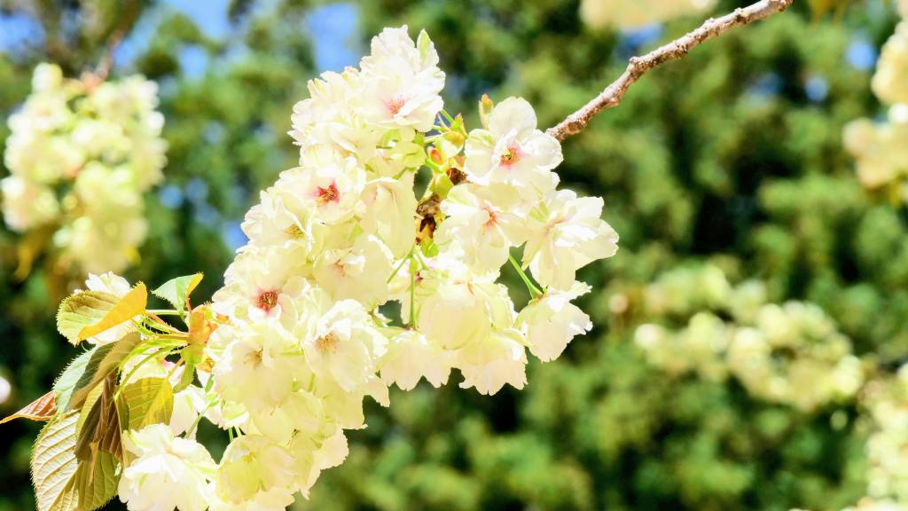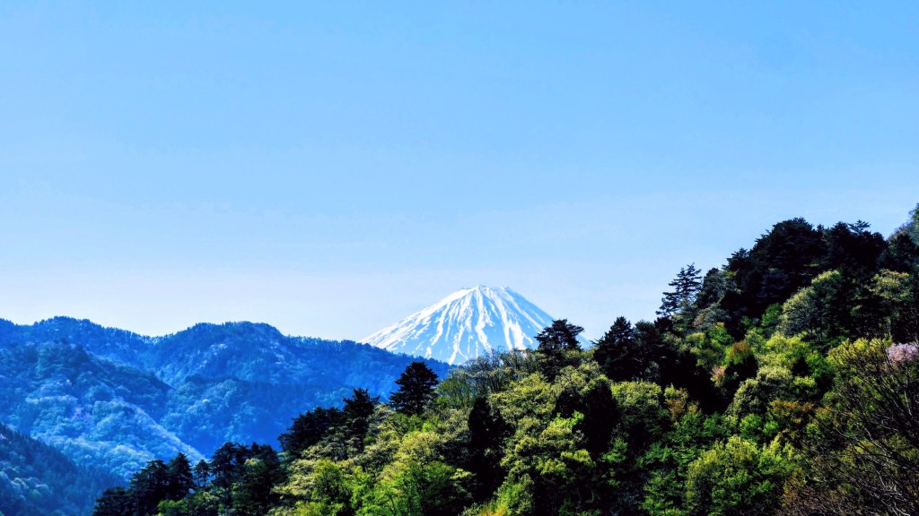 ウコン桜(鬱金桜)はふつうの桜と違って、薄黄色とも薄緑色とも淡い黄金色ともいわれる独特の色合いの花を咲かせます。このウコン桜めあての観光客が大勢きていましたね。天気に恵まれ、富士山もくっきり。