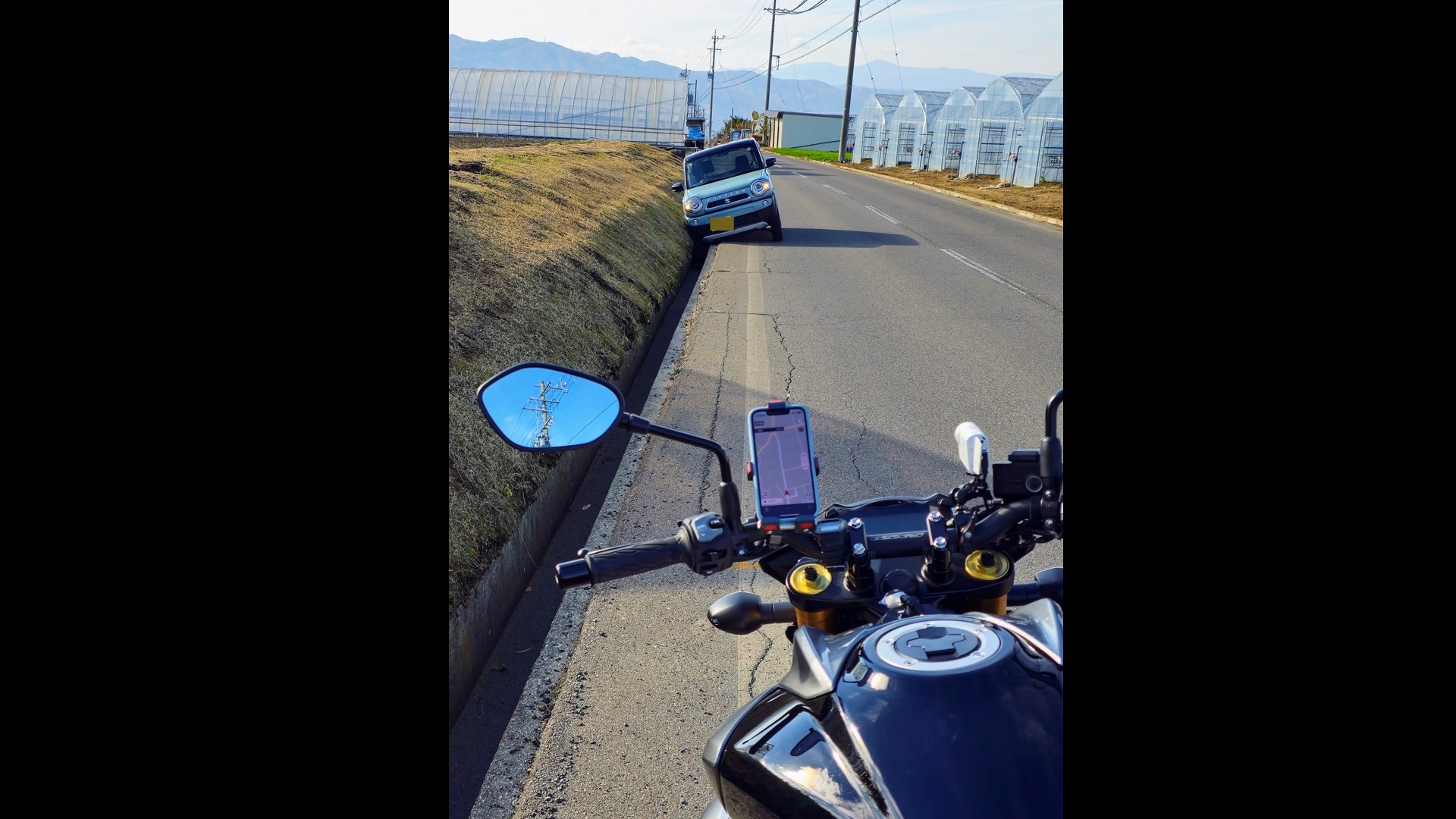走行中、奥さんからの電話着信音が鳴り、会話しようと路肩に停車したその時、対向車がこちらに向かってはみ出し走行。「わぁ、ぶつかる!!」と思ったら、側溝に脱輪して自滅してくれました。バイクのドライブレコーダーにもしっかり撮れてました。