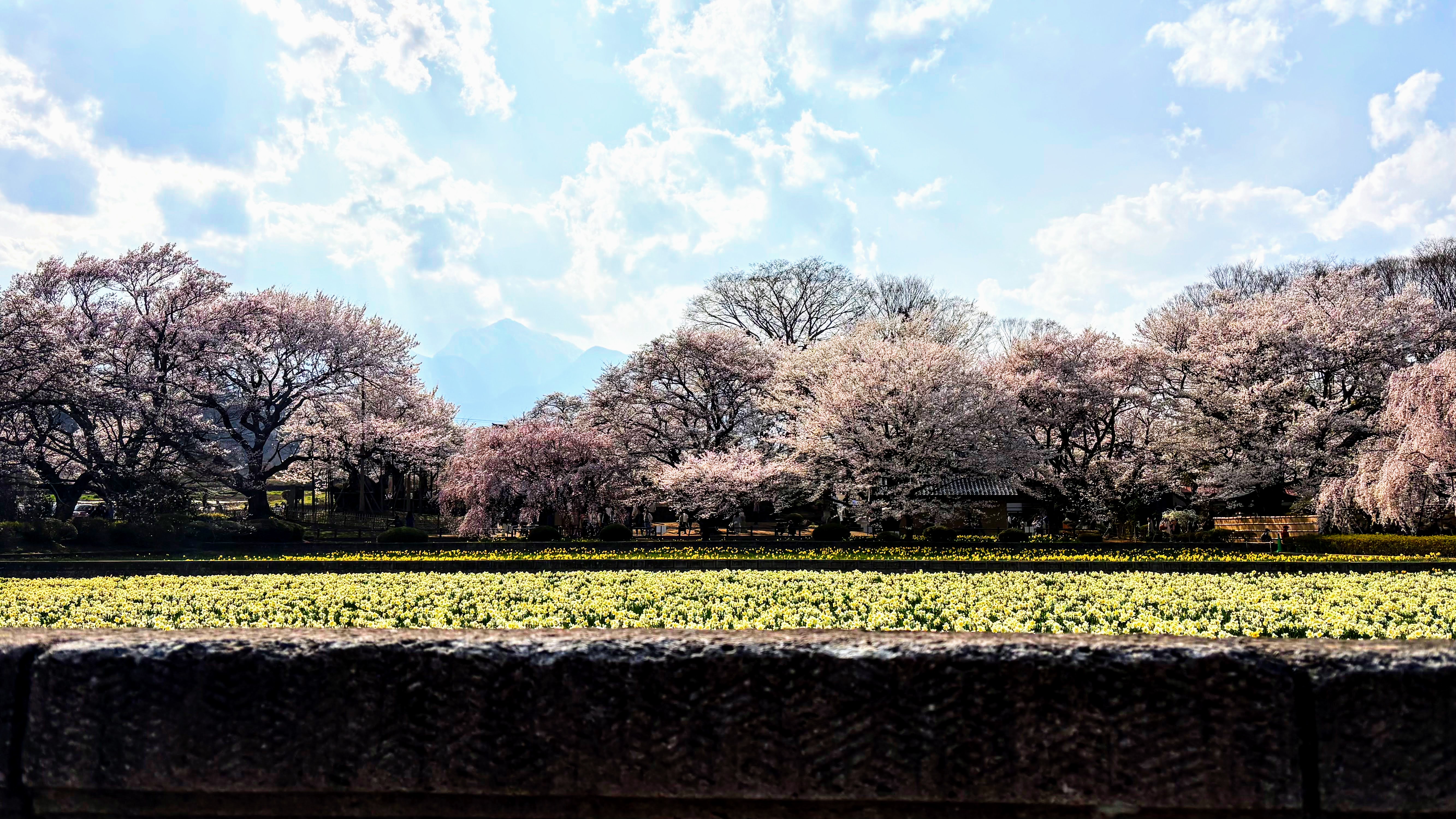 この日は快晴とはならなかったのが残念ですが、翌日からはずっと天気予報が雨だったこともあり、この日のお花見となりました。晴れていれば、桜の向こうに甲斐駒ヶ岳の雄姿がくっきり見れるのですが、この日は厚い雲が隠してしまい、残念でした。